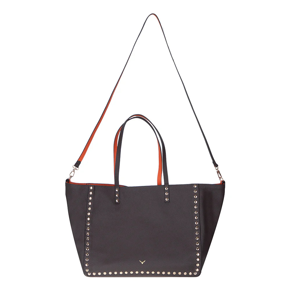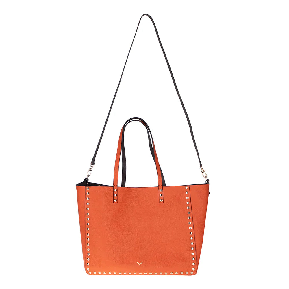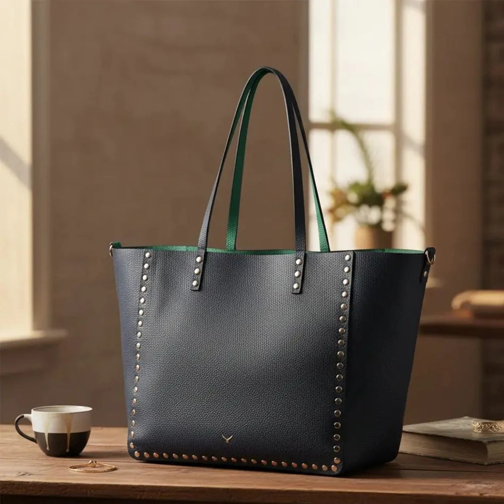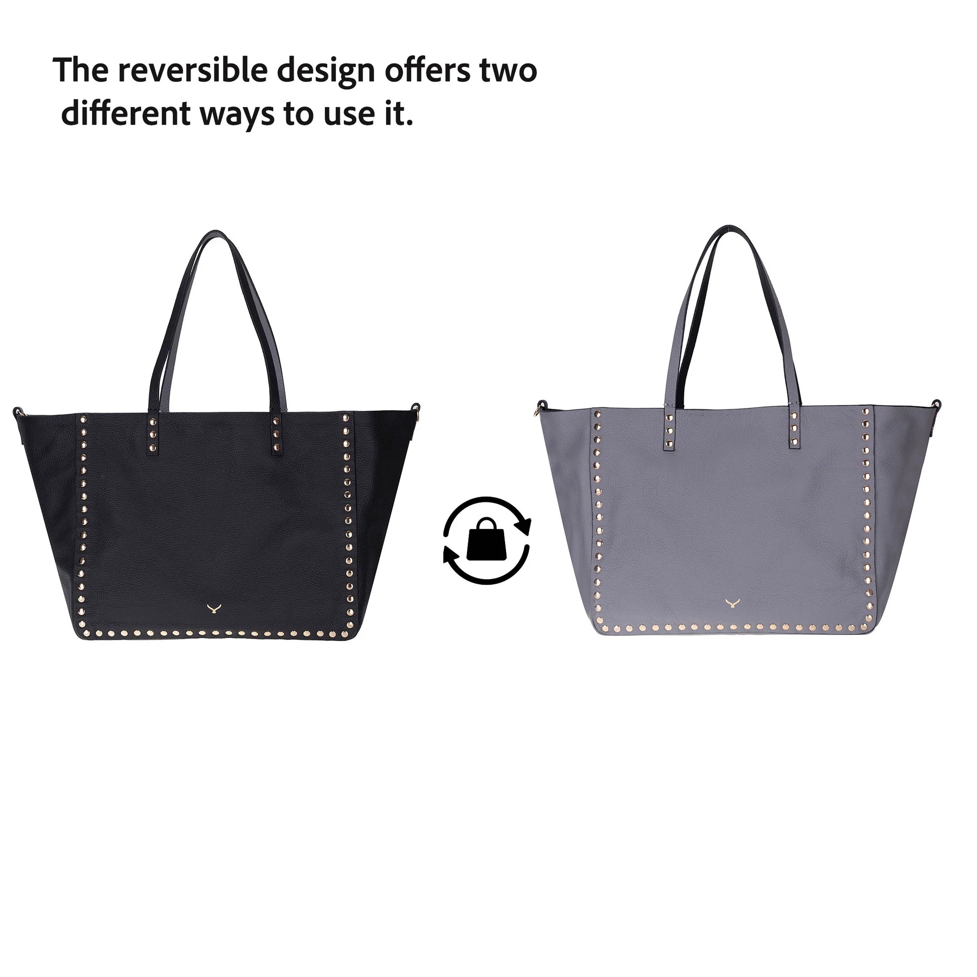 An ever-stylish leather tote that adjusts according to your needs. Legacy's reversible tote allows you to switch seamlessly between two striking colors with just one move. Made with genuine leather and enhanced by metallic studs that embody contemporary style, the tote is perfect for the office, travel, or any sophisticated occasion.