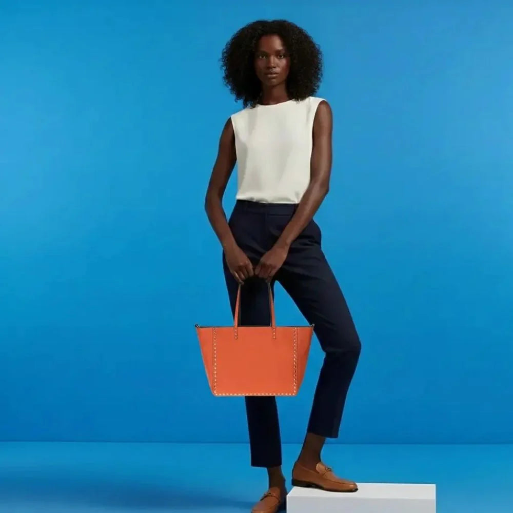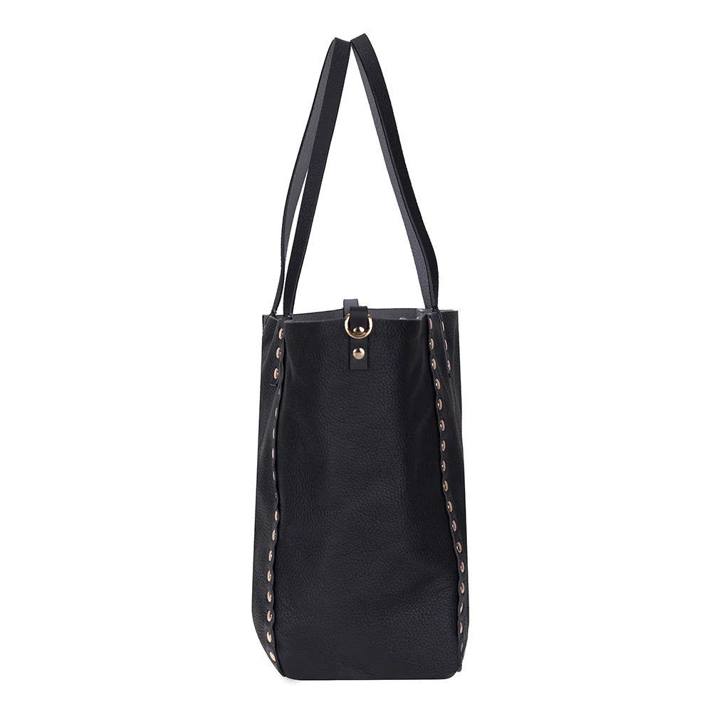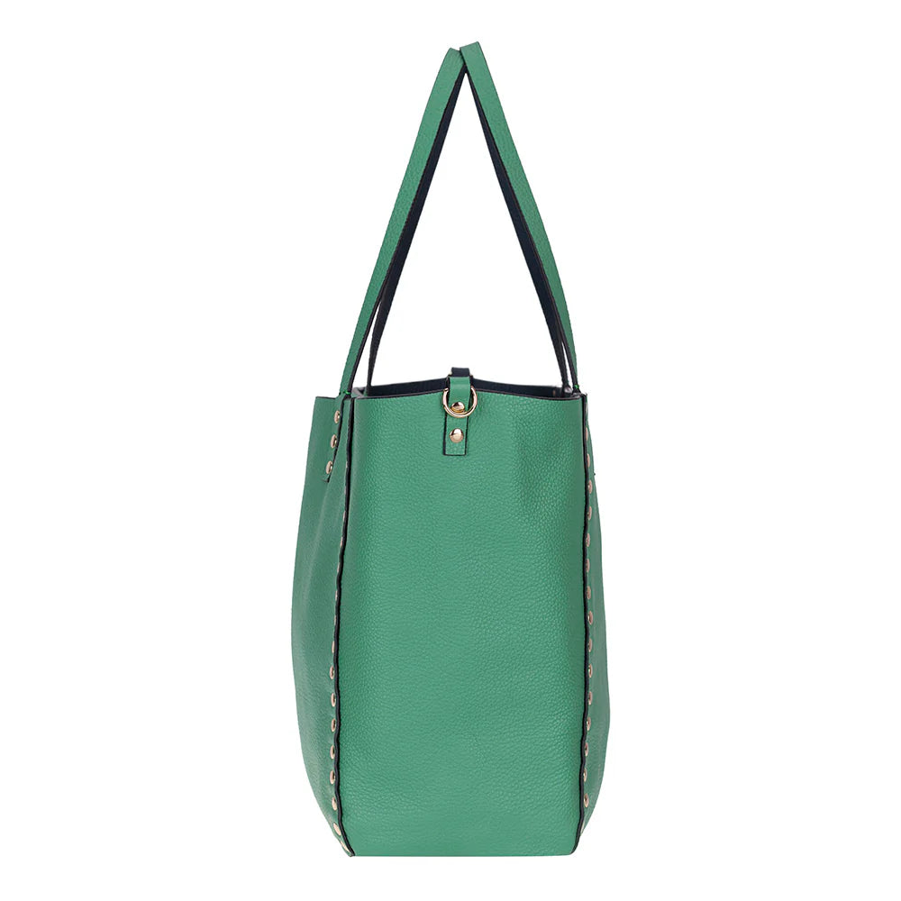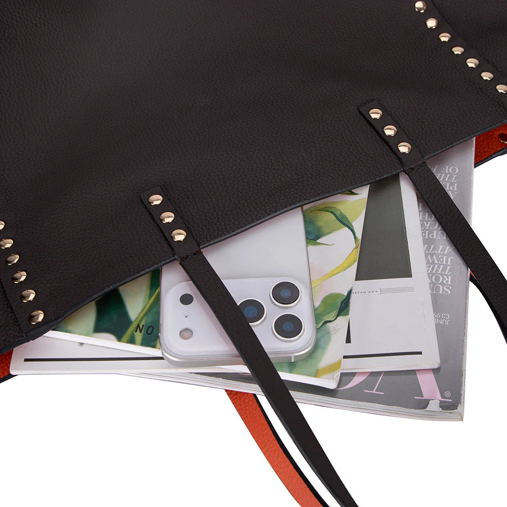 An ever-stylish leather tote that adjusts according to your needs. Legacy's reversible tote allows you to switch seamlessly between two striking colors with just one move. Made with genuine leather and enhanced by metallic studs that embody contemporary style, the tote is perfect for the office, travel, or any sophisticated occasion.